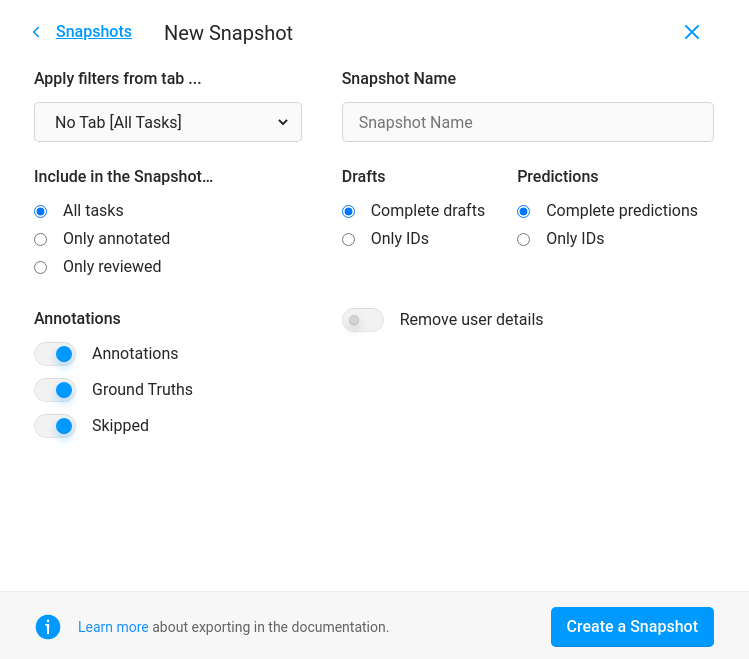 PROJECT-NAME-at-YEAR-MM-DD-HH-MM, where the time is in UTC. - Include in the Snapshot…: Choose which type of data you want to include in the snapshot. Select All tasks, Only annotated tasks, or Only reviewed tasks.
